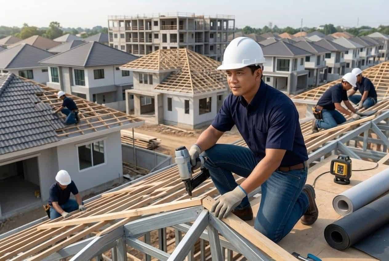 Menyediakan jasa pemasangan rangka atap menggunakan material baja ringan berkualitas tinggi maupun sistem konvensional. Tim ahli kami memastikan kalkulasi beban secara presisi dan pemasangan rapi demi menjamin keamanan serta ketahanan bangunan Anda terhadap segala cuaca.